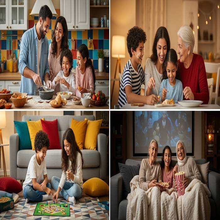 الفكرة: تنظيم يوم خاص للعائلة يحتوي على أنشطة متنوعة (طهي مشترك، لعب ألعاب تقليدية، رسم، سينما منزلية، نزهة).